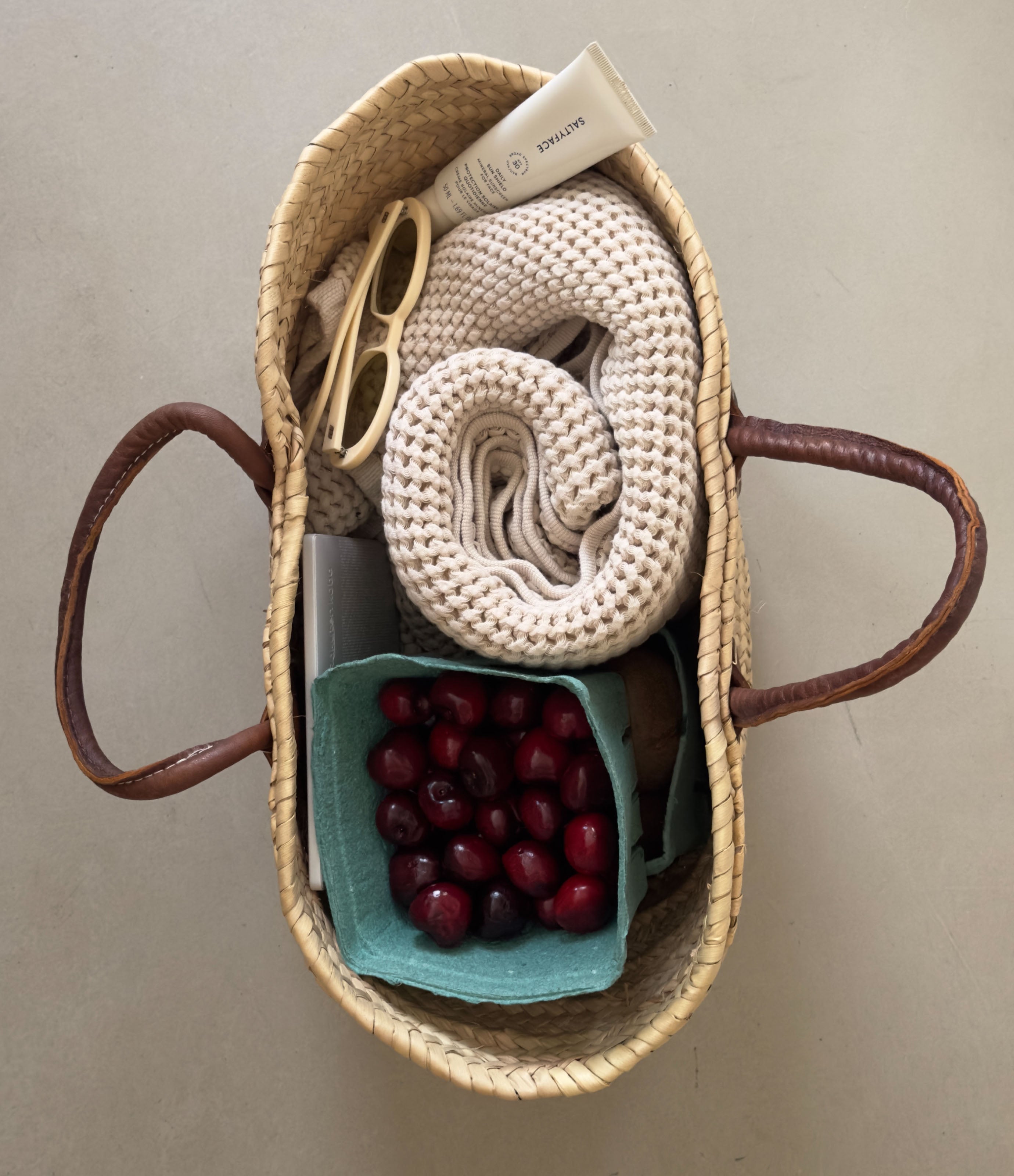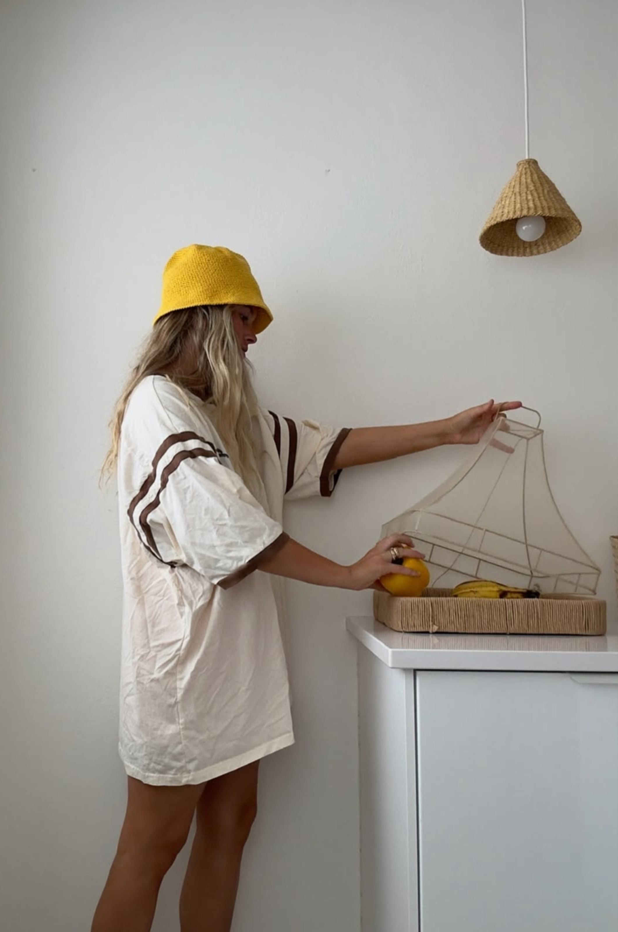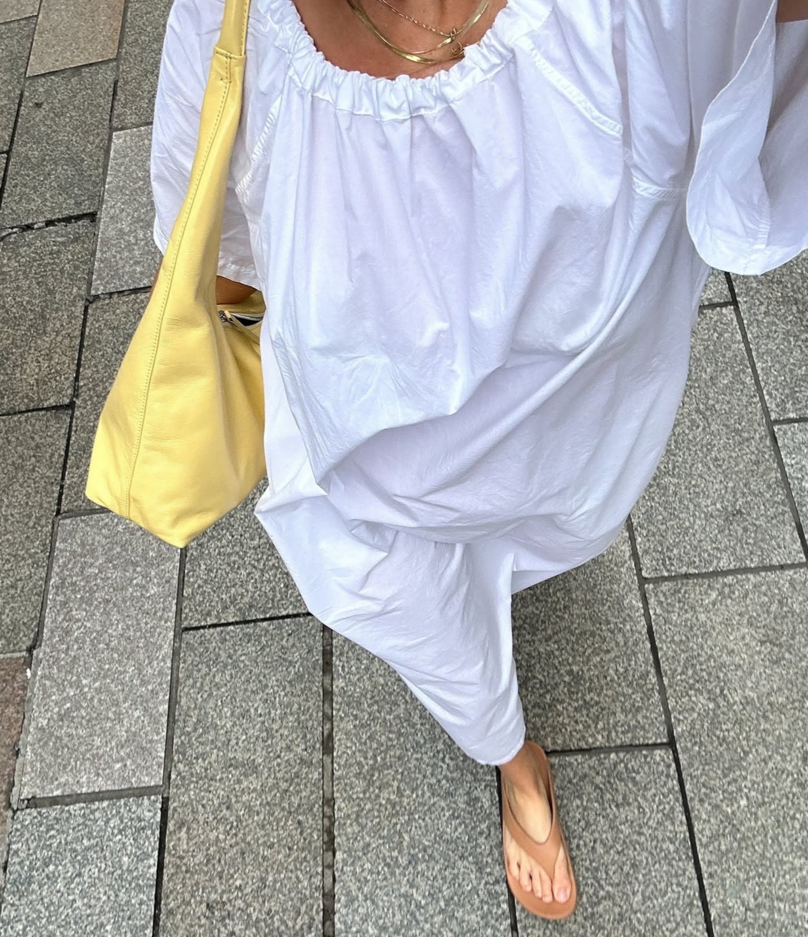 Lately I’ve been living in baggy denim shorts, a linen shirt and leather fisherman sandals. I switch up the bag I pair with it depending on my mood. Usually it’s a sunny yellow bag by Marge Sherwood.